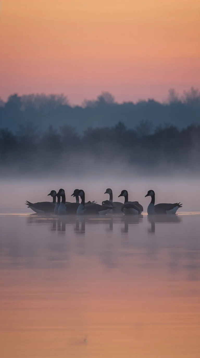 Some wallpapers show the harsh side of the journey: geese pushing through heavy snow, frost crystals clinging to their feathers, breath turning into icy vapor. Others reveal rare quiet moments: birds pausing on a peaceful lake at dusk, water reflecting the sky like glass while they gather strength for the miles ahead. Each wallpaper is a tiny blend of documentary realism and poetic imagination.