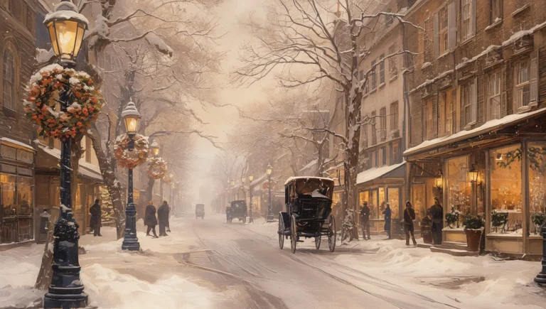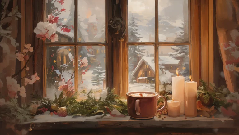 Each wallpaper in this collection captures a different aspect of holiday nostalgia. Some images highlight a richly decorated vintage fireplace, filled with garlands, ribbon and brass ornaments. Others explore snowy winter exteriors—a cottage at dusk, a quiet forest cabin under glowing stars, or a traditional village covered in fresh snowfall. The Victorian-era streets add a narrative quality, as if the viewer could wander into the scene and hear carol singers in the distance. There are also still-life studies featuring cocoa, candles, gingerbread and antique ornaments, reminiscent of classic oil-painted holiday illustrations.