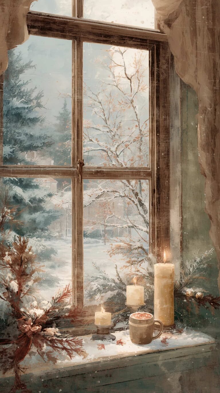 The color palette is consistent across all images to maintain a unified aesthetic. Soft browns, muted reds, warm golds, deep greens and sepia undertones set the emotional tone. These shades create a warm, cozy contrast against the colder winter blues and whites of the snowy exteriors. The result feels harmonized and deeply vintage—exactly what people search for when they want Christmas wallpapers that feel intimate, artistic and timeless.