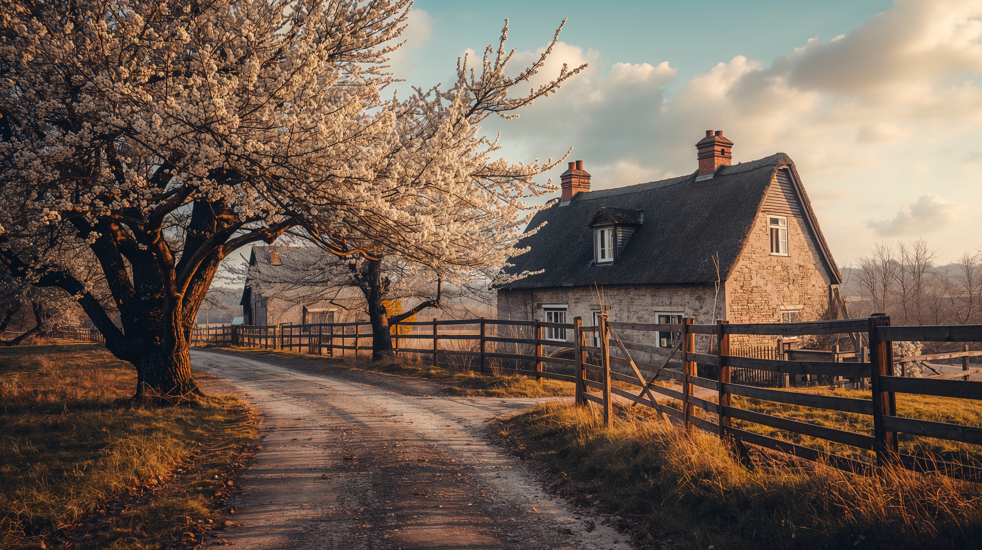 - Cherry blossom countryside cottages with soft pink petals floating in warm spring light.