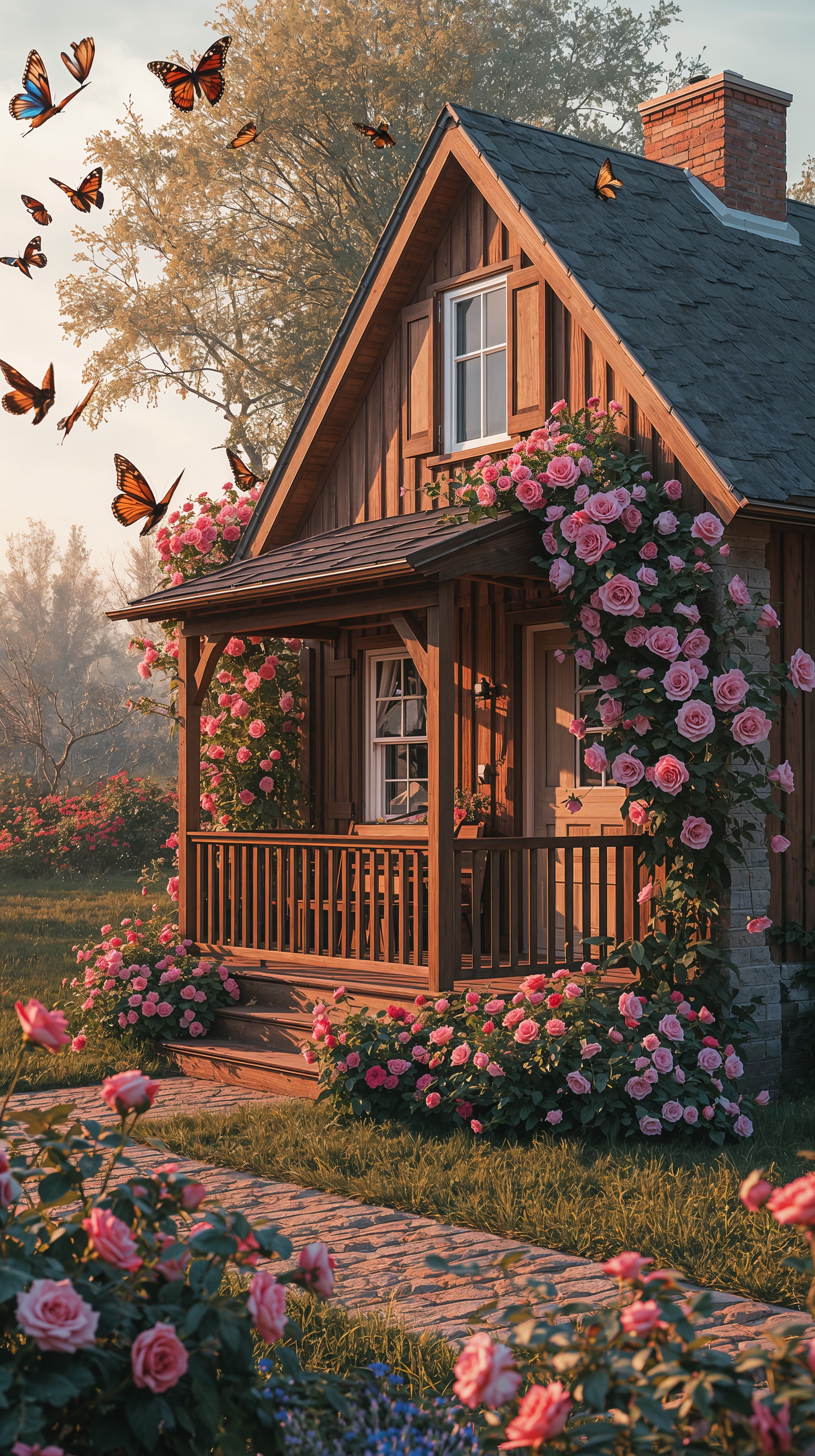 - Rustic garden cottages surrounded by blooming roses and wooden fences.