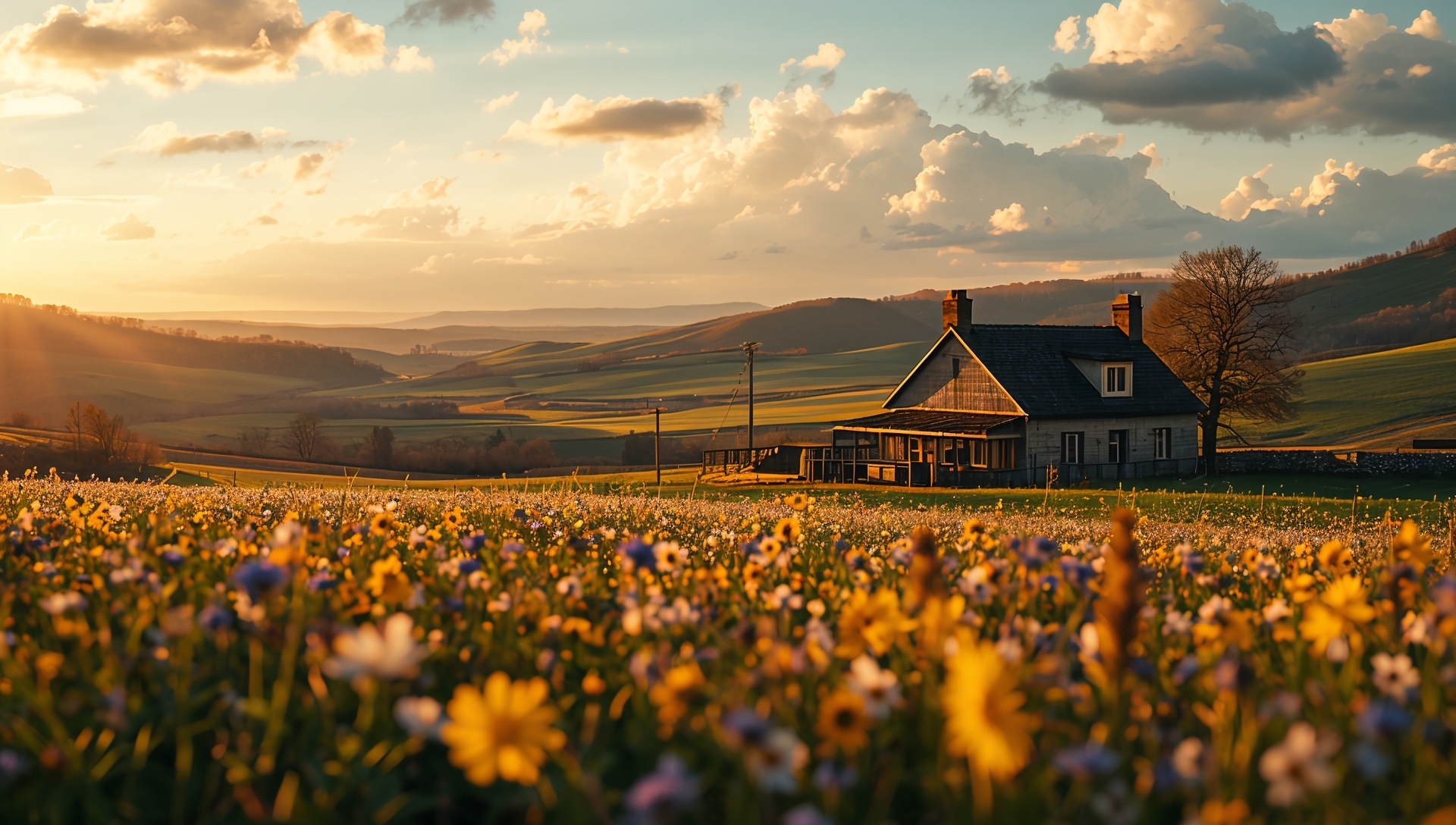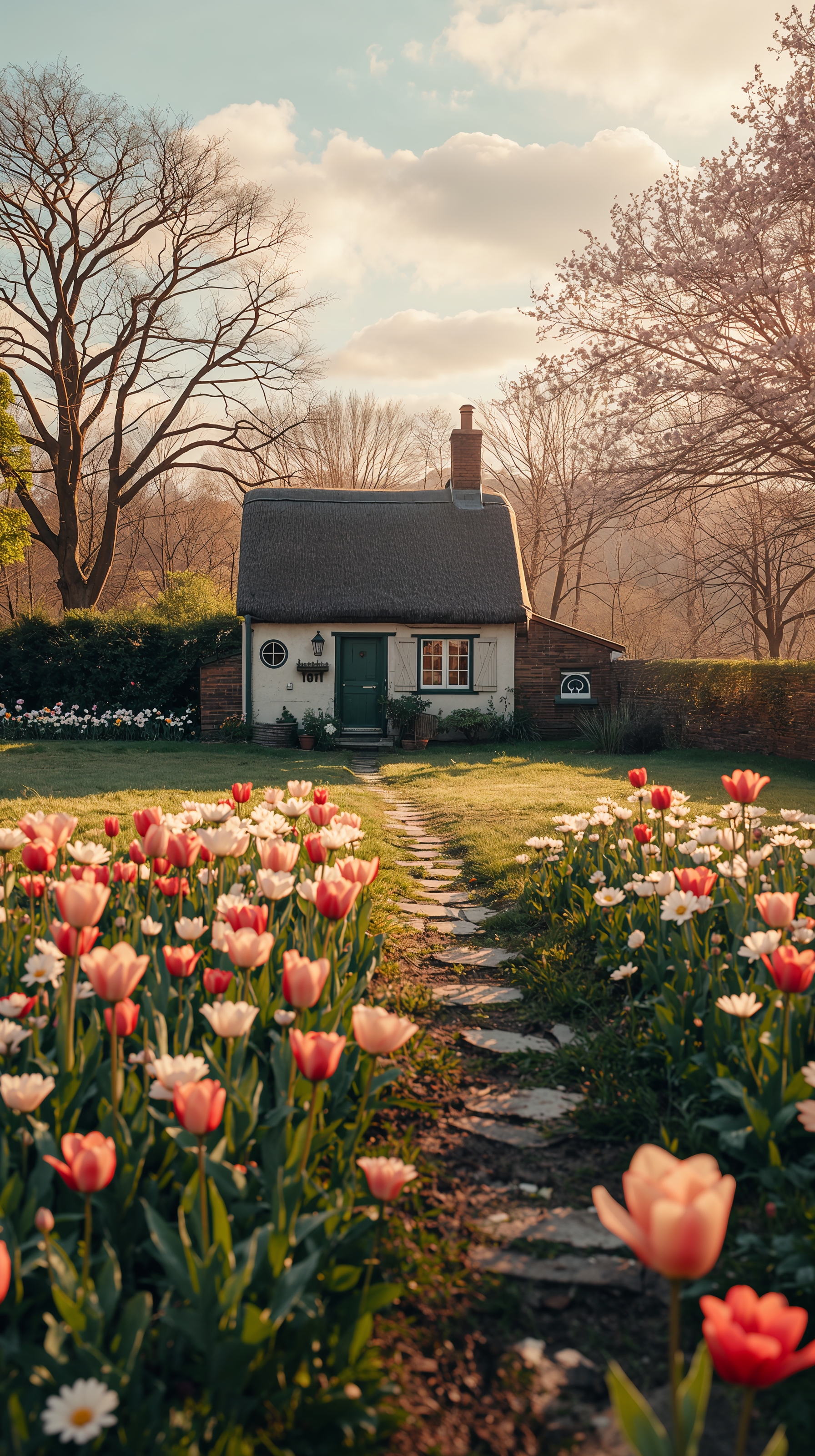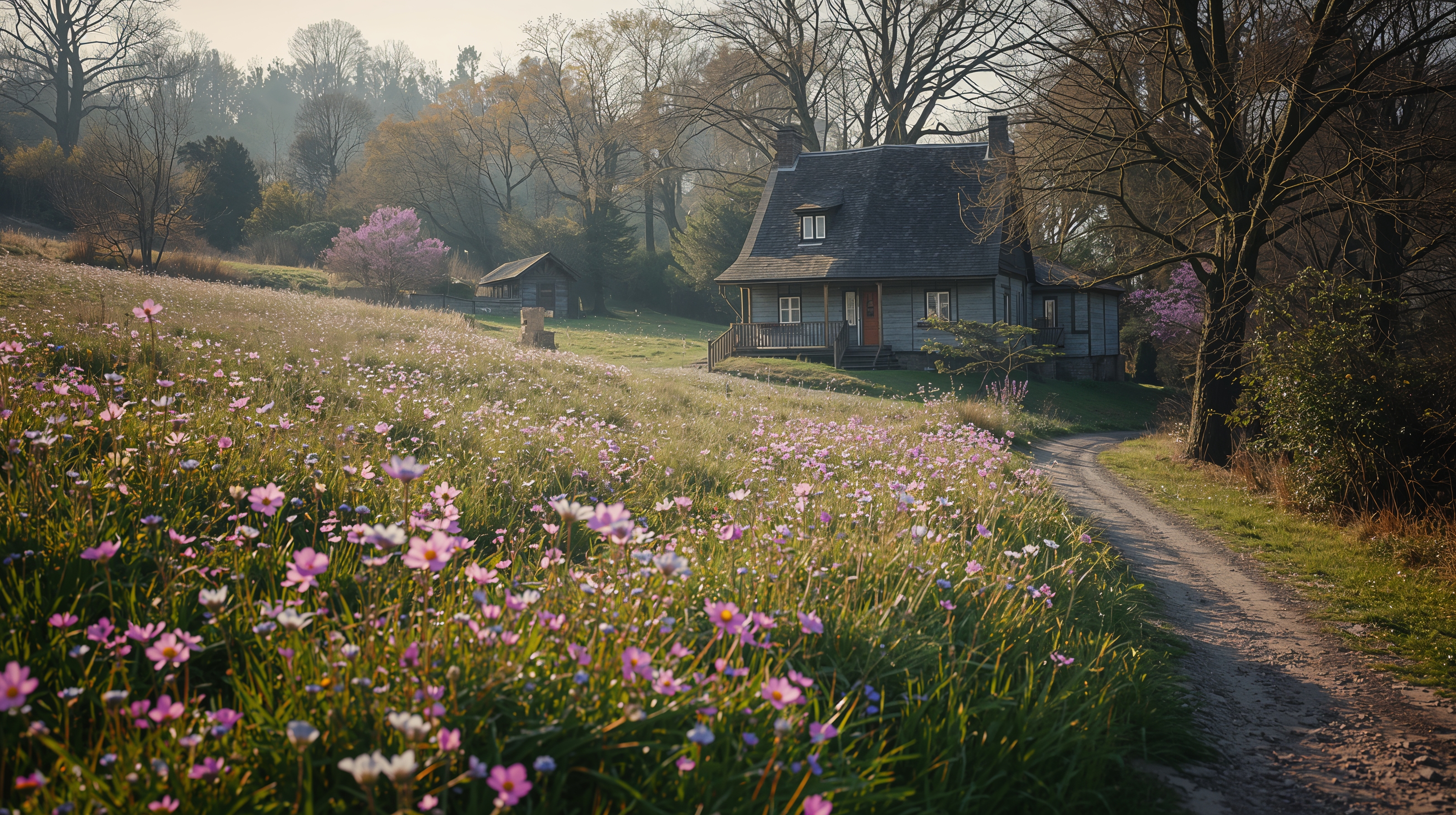 - Wildflower meadow cottages where small houses sit peacefully among colorful spring flowers.