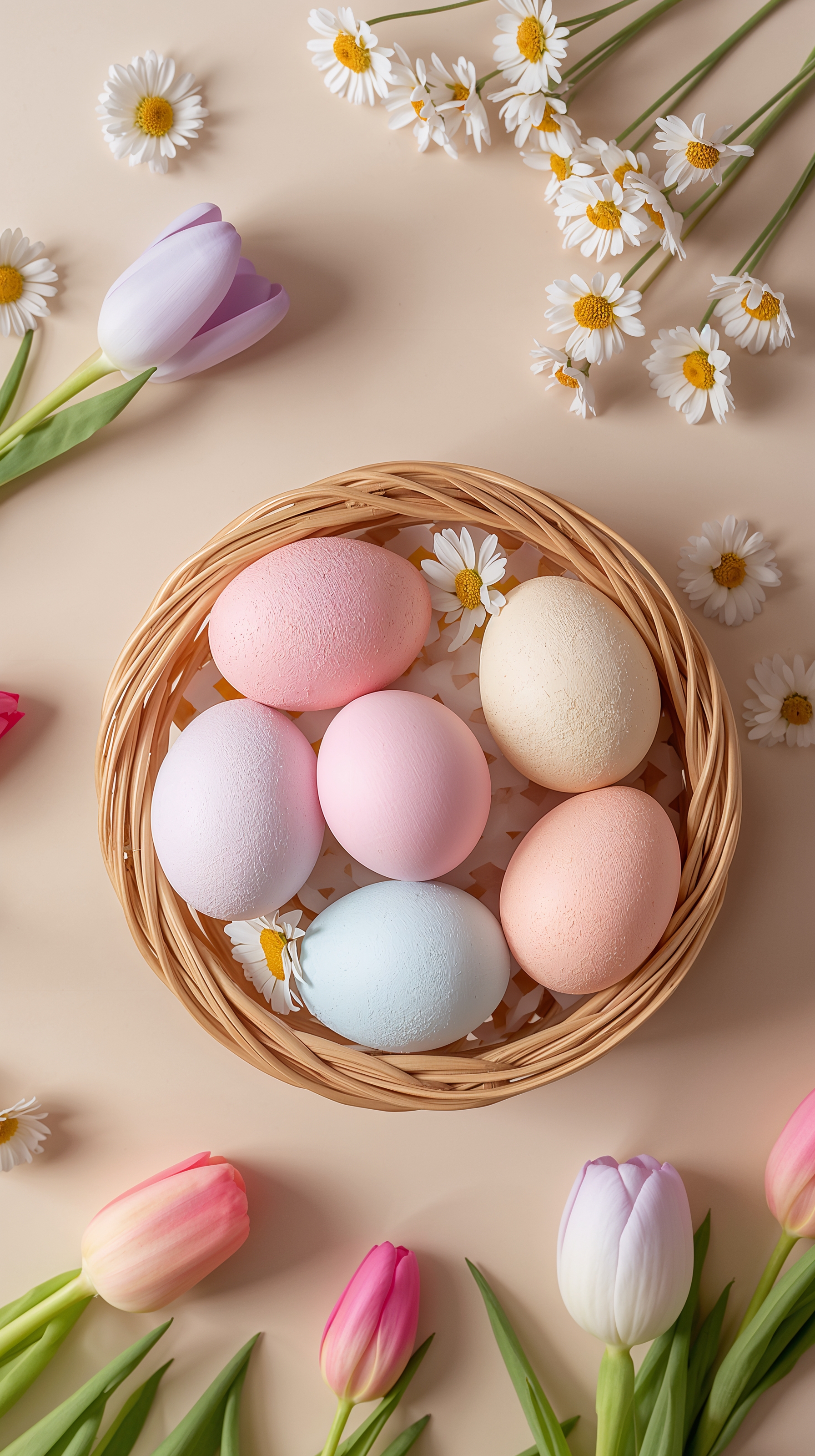 Many users prefer subtle seasonal wallpapers rather than heavy decorations. Soft eggs in a flower meadow or pastel baskets on linen backgrounds feel light, elegant, and easy to enjoy for weeks.
