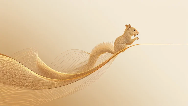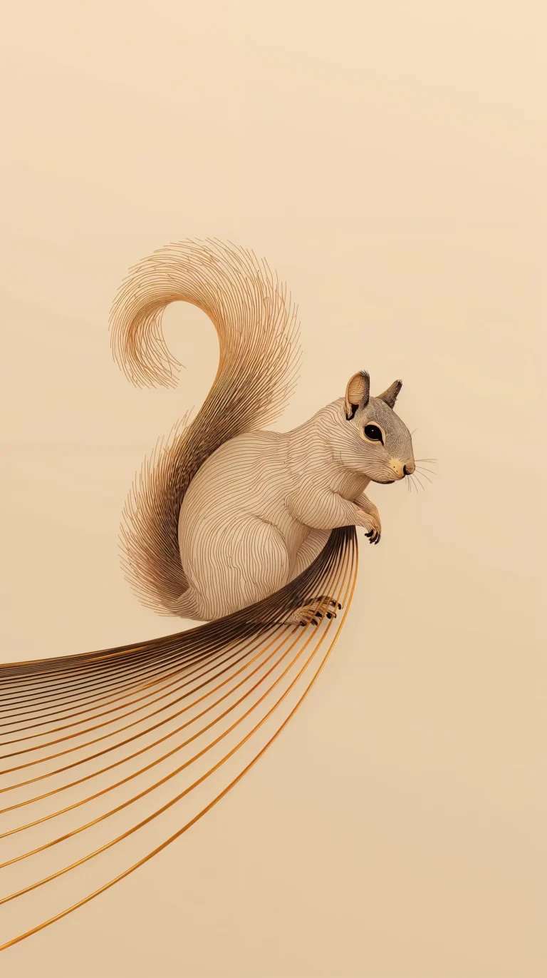 In the evolved version, that same idea transforms into a breathtaking fine-line sculpture. The line now bends and multiplies, forming luminous strands of bronze and gold that cradle the squirrel’s body. Its tail rises like a wave of light, each strand following an invisible mathematical path.
