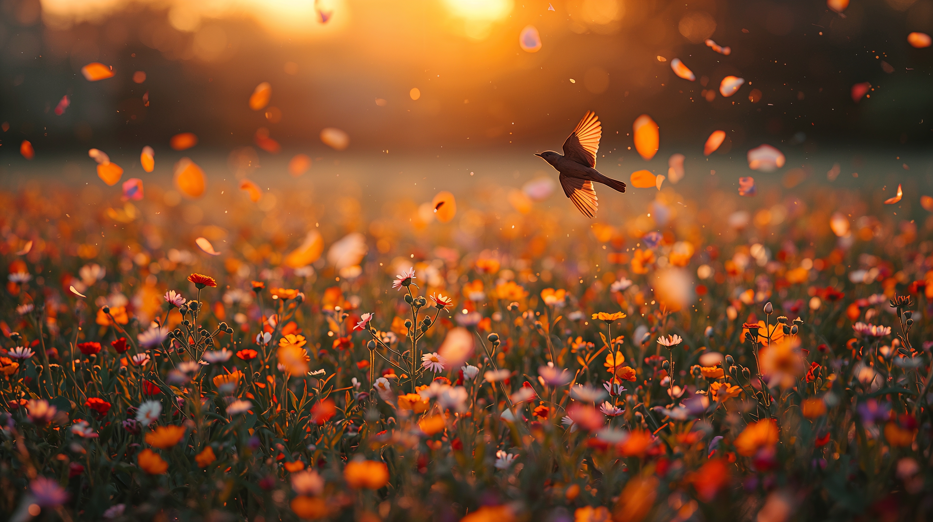 - Desktop wallpapers benefit from landscape scenes like birds flying above wildflower meadows.