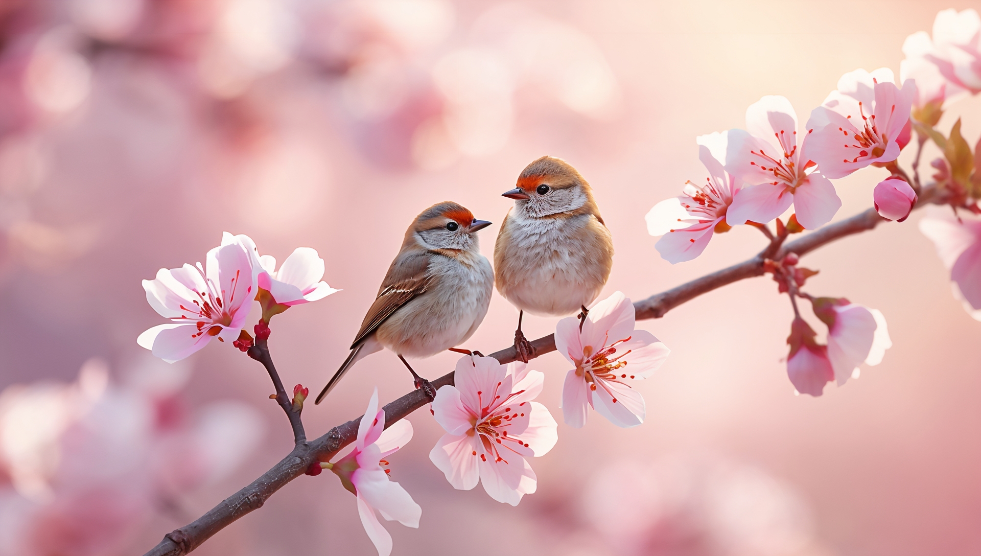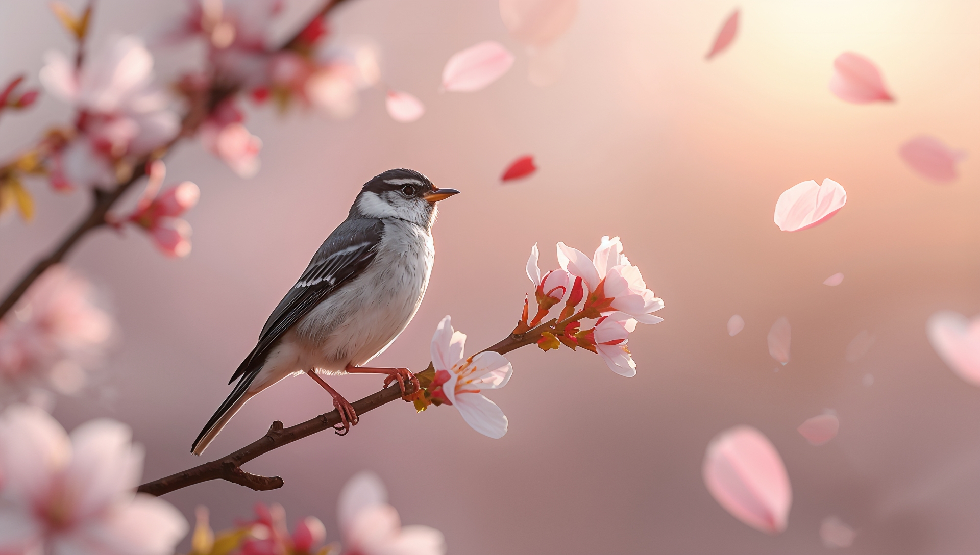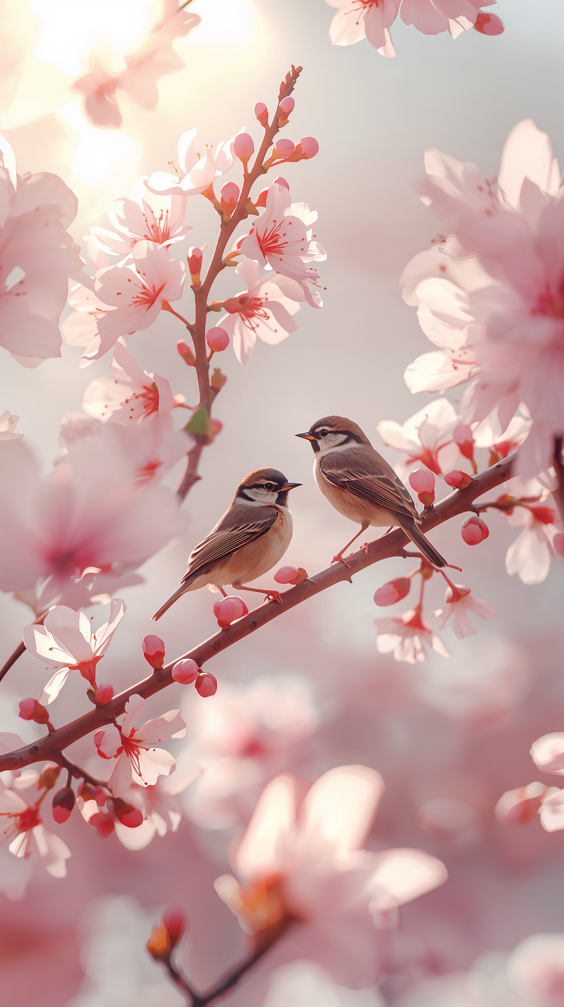 Choose soft images like birds resting on branches, birds surrounded by cherry blossoms, or gentle macro photography with blurred backgrounds.