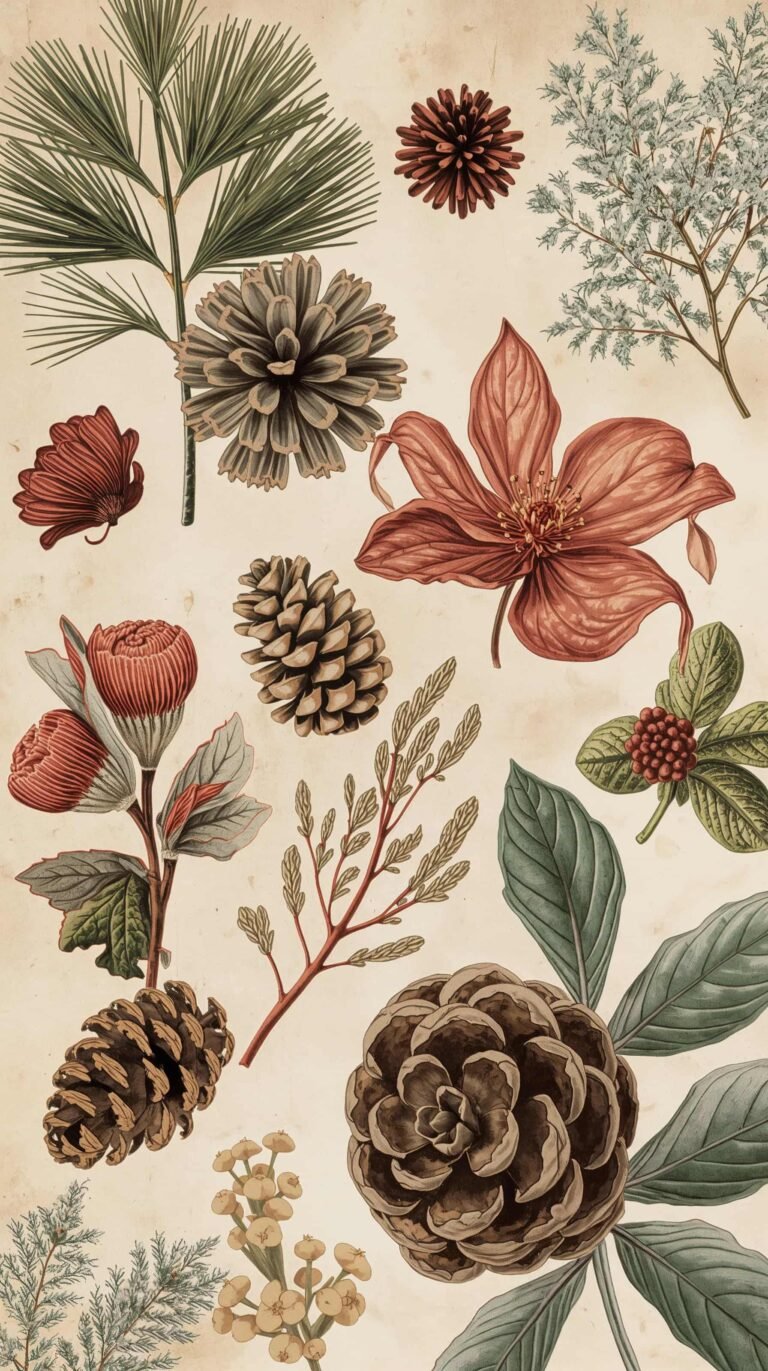 A vintage aesthetic adds warmth and nostalgia to this foundation. It brings soft beige tones, textured backgrounds, slightly faded inks, and a feeling as if every illustration carries history with it. When combined with winter elements—snow-dusted leaves, frosty berries, dried florals—the result is an elegant, timeless aesthetic. This is what makes vintage botanical winter wallpapers so unique: they feel both artistic and seasonal, refined yet comforting, a perfect balance of old-world charm and modern minimalism.