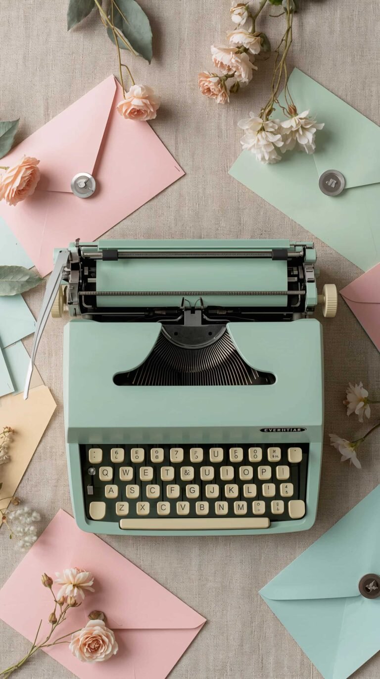 Even the pastel cloudscape adds a soft, airy escape — a gentle retro sky that feels like the beginning of a calm afternoon. The tea room wallpaper, with its pastries, lace tablecloths, and glowing light, invites warmth and comfort, while the pastel typewriter flat lay gives a nostalgic nod to creativity, journaling, and old-fashioned storytelling. Each image blends pastel tones with the visual softness of retro film grain, making the entire selection feel charming, familiar, and soothing.