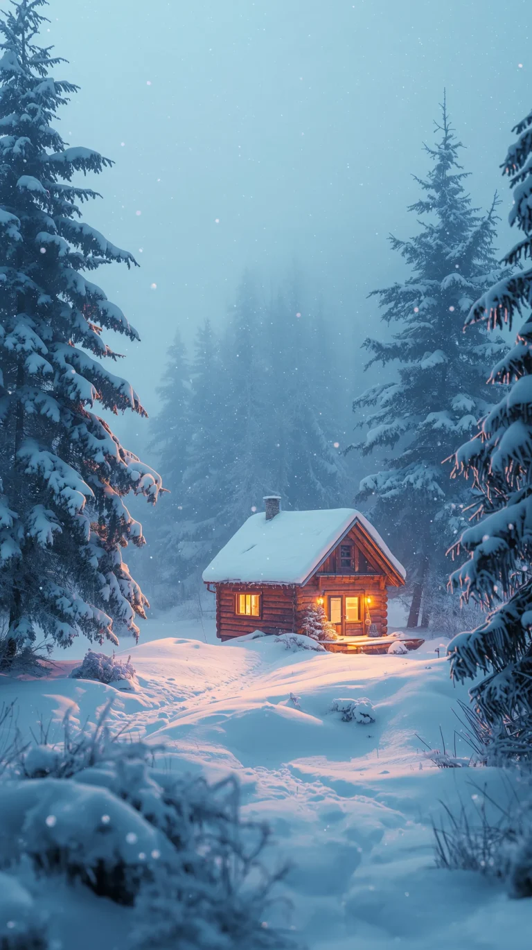 For this collection, we used a carefully curated palette of soft blues, icy whites and gentle silver tones — the colors that define classic winter wonderland backgrounds. These shades create a natural sense of serenity, making every image feel cold, crisp and magical. The warm golden lights from the cottages balance the coolness, adding comfort and coziness to each composition. The contrast between glowing windows and frozen landscapes is one of the most iconic elements of winter backgrounds, and it instantly enhances focus and relaxation when applied as wallpaper. Blue and white tones are also known to reduce visual noise, making your phone or iPad feel calmer the moment you unlock it.